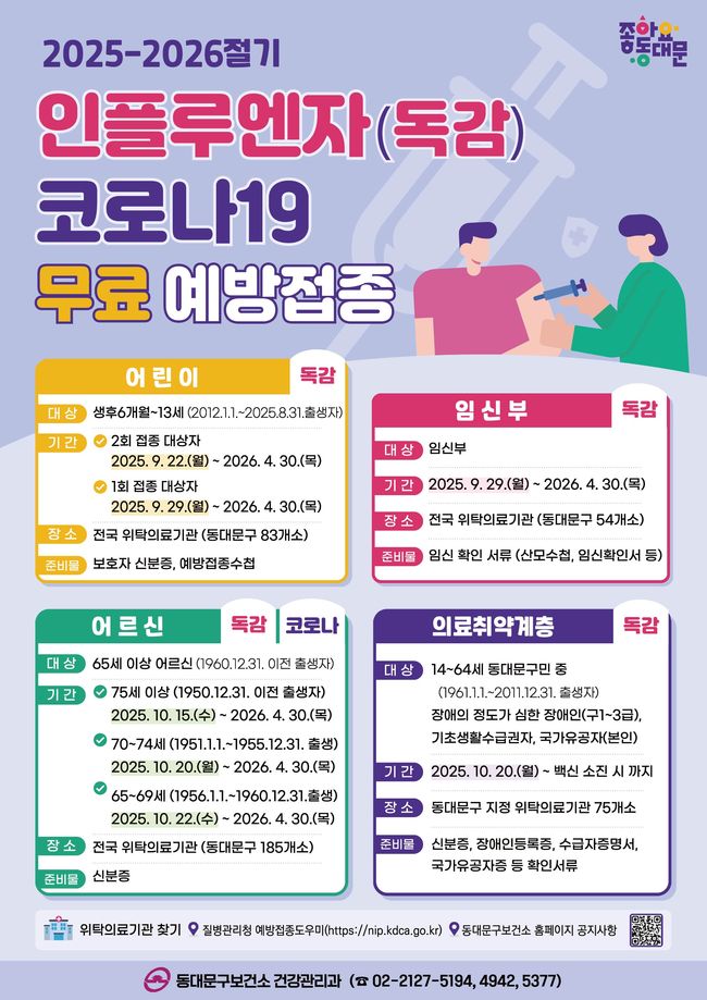동대문구, 22일부터 인플루엔자 예방접종 실시 - 6개월~13세 어린이·임신부·65세 이상 어르신 등 무료 지원 - 기초생활수급자·중증장애인·국가유공자 등 의료취약계층 포함 - 코로나19 동시 접종 권고, 지정 의료기관 190개소 운영