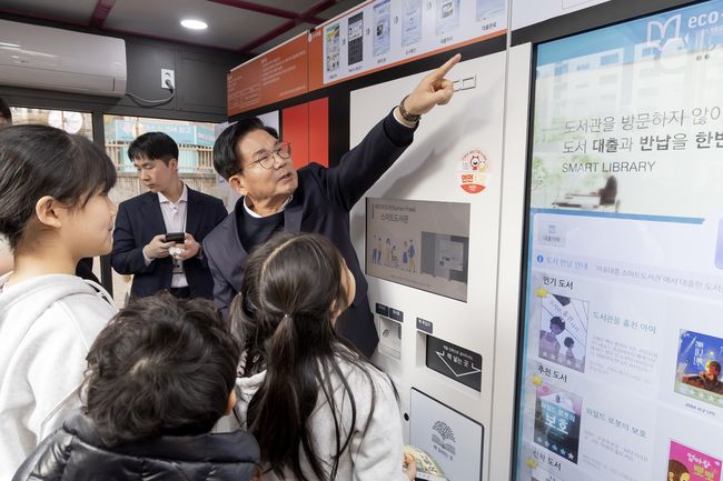 아이들에게 도서관 이용 방법을 알려주는 박강수 마포구청장.