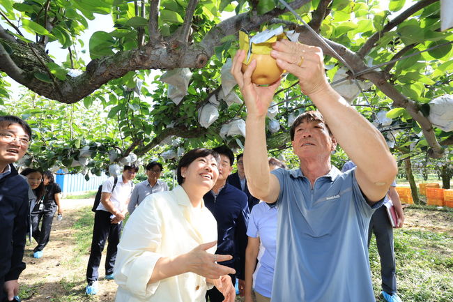 송 장관은 농업인들에게 “집중호우와 폭염 속에서도 과원 관리와 병해충 방제에 힘써 주신 노고에 감사드린다”며 “고온 피해를 줄이기 위해 열매 성숙 상태를 주기적으로 확인하고, 장기 저장용 배는 조기에, 추석 성수품은 적정 시기에 수확해달라”고 당부했다.