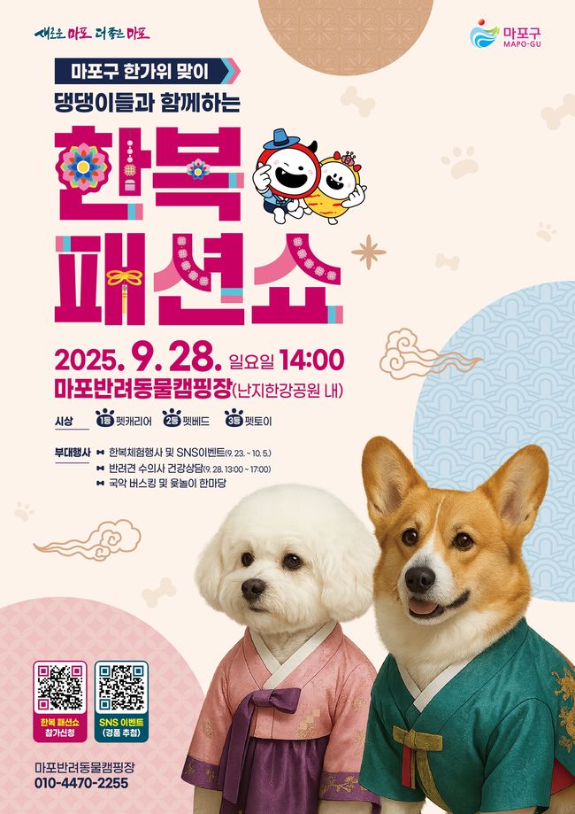 마포반려동물캠핑장, 추석 맞아 ‘댕댕이 한복 패션쇼’ 참가자 모집 - 반려견 100팀 선착순 모집, 한복 입고 가족과 함께 즐기는 행사 - 심사 통해 입상견·인기견 시상, 펫캐리어·펫베드 등 다양한 경품 제공 - 윷놀이 대회·퓨전 국악 버스킹·건강상담 부스 등 다채로운 즐길 거리 마련